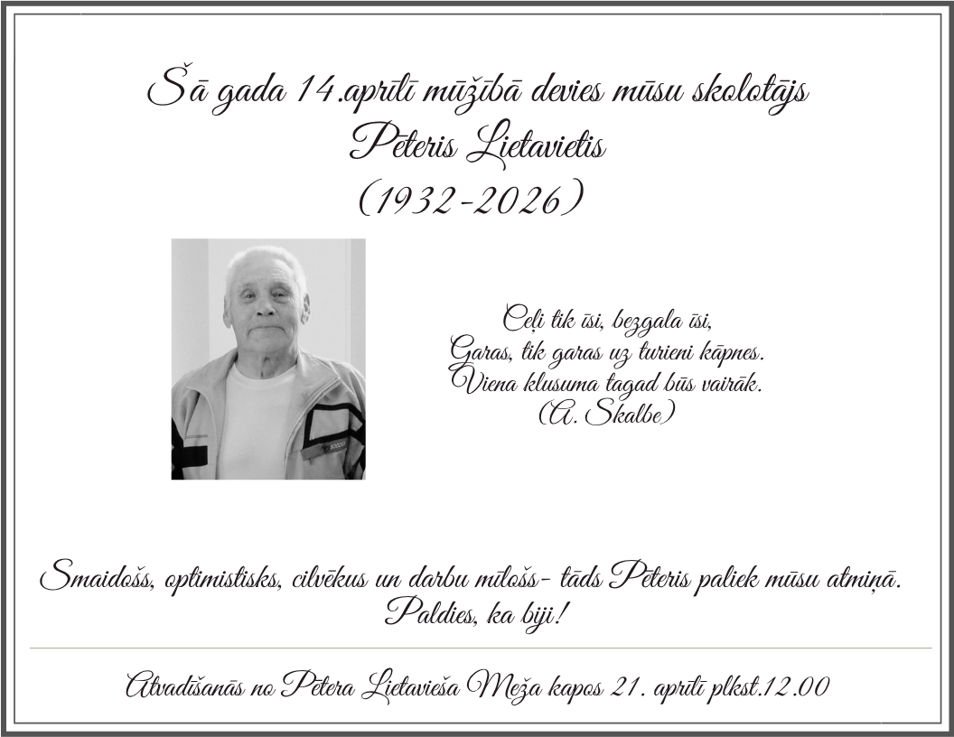 Aicinām izveidot īsu, aptuveni 5 sekundes ilgu video vertikālā formātā, kurā, ar rokām metot sniegu gaisā, tiek izteikts novēlējums skolai tās dzimšanas dienā. Video lūdzam iesniegt līdz svētdienas (11.01.) plkst. 20.00 šeit