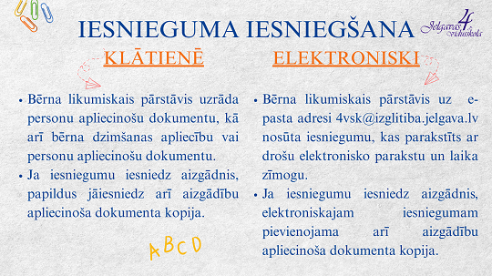 Uzņemšanas gadījumā skolēna likumiskajam pārstāvim skolā klātienē jāuzrāda personu apliecinošs dokuments un jāiesniedz
